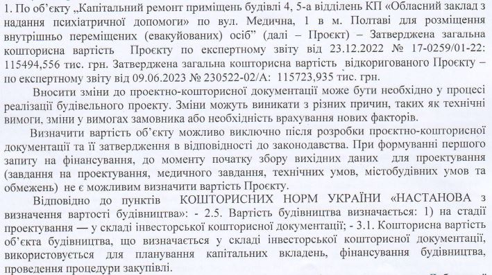 Ми звернулись з питанням, чому зросла вартість ремонту, до обласного департаменту будівництва. Виявилось, що вартість проєкту не можна визначити при формуванні першого запиту на фінансування, а лише після розробки і затвердження проєктно-кошторисної документації.