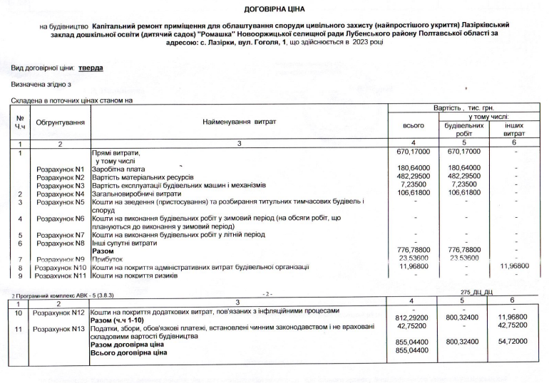 Як повідомляється у договірній ціні, більша частина коштів піде на прямі витрати – 180 тис. 640 грн спрямують на заробітну плату, 482 тис. 295 грн – на придбання матеріальних ресурсів, понад 7 тисяч гривень – на експлуатацію будівельних машин і механізмів. Загальновиробничі витрати становлять 108 тисяч 618 гривень. Прибуток підрядника – 23 тисячі 536 гривень.