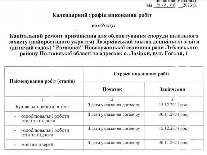 Згідно з календарним графіком робіт, виконавець має вже почати виконувати перші роботи – монтаж дверей, оздоблювальні роботи стелі та підлоги й завершити їх до 30 листопада. Другим етапом є проведення оздоблювальних робіт стін та підлоги – підрядник має виконати їх до 15 грудня.