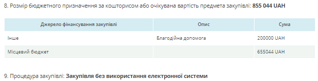 Вартість робіт складає 855 тис. грн, із яких 655 тисяч виділять з місцевого бюджету, інша сума (200 тисяч) – це благодійна допомога. Ціна є твердою. Процедуру закупівлі провели без використання електронної системи, обравши підрядника самостійно.