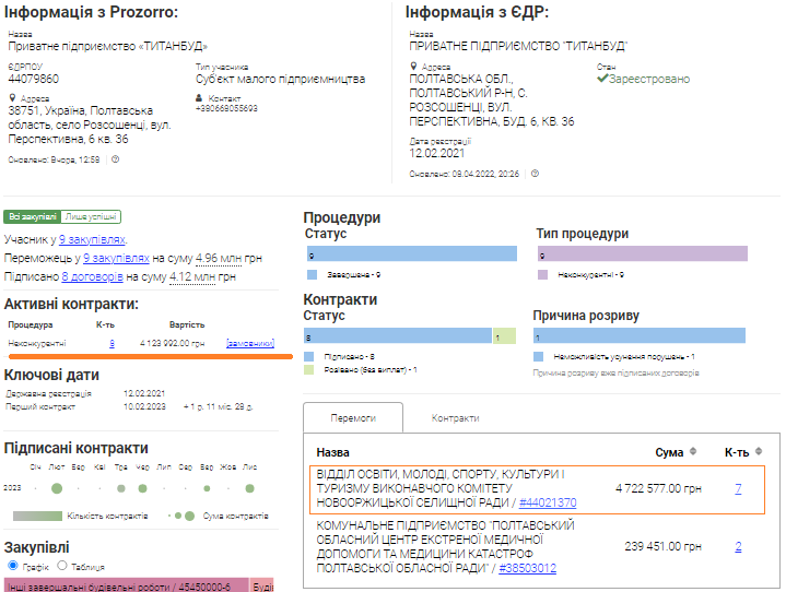 Крім відділу освіти Новооржицької селищної ради, ПП “ТИТАНБУД” уклав дві угоди з КП “Полтавський обласний центр екстреної медичної допомоги та медицини катастроф Полтавської обласної ради” на загальну суму 239 тис. 451 грн.