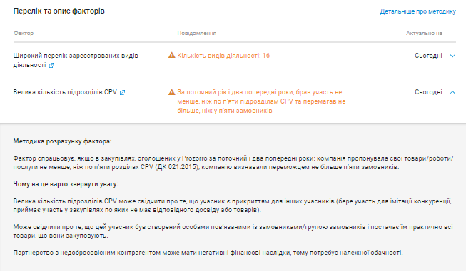 - Велика кількість підрозділів CPV може свідчити про те, що учасник є прикриттям для інших учасників (бере участь для імітації конкуренції, приймає участь у закупівлях по яких не має відповідного досвіду або товарів).