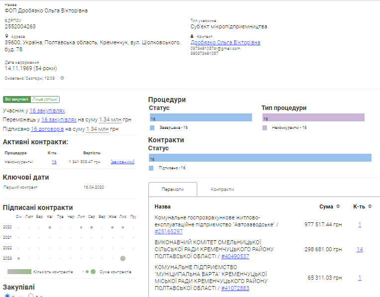 Договір уклали з ФОП Дробязко Ольга Вікторівна, яка, згідно з інформацією на сайті Youcontrol, зареєстрована понад 20 років тому в Кременчуці. Головною її спеціалізацією є роздрібна торгівля одягом у спеціалізованих магазинах. Також серед видів її діяльності – будівництво, штукатурні та малярні роботи, а ще геть несумісні з вищевказаними видами виробництво текстильних виробів, роздрібна торгівля невживаними товарами, денний догляд за дітьми тощо.