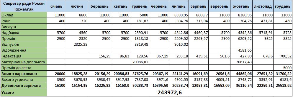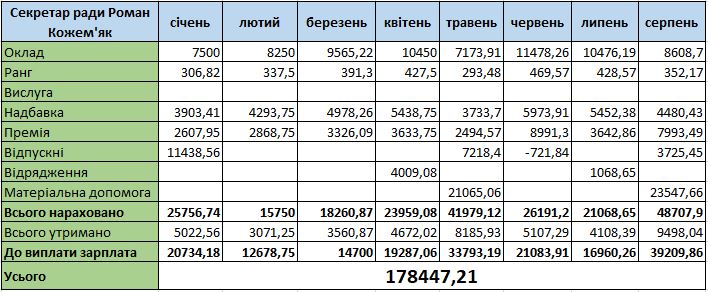 Матеріальну допомогу нарахували двічі на рік. У минулому році її розмір склав приблизно 20 тис. грн. Цьогоріч – 21 065 грн у травні та 23 547 грн у серпні. Відповідно у серпні Роман Кожем’як мав і найбільшу зарплатню – понад 39 тисяч.