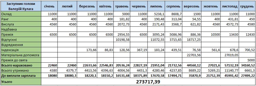 У вересні 2022 року Валерій Кулага був у відпустці. У той місяць йому нарахували 22 703 грн матеріальної допомоги (ймовірно мова йде про оздоровчі). Також матеріальну допомогу нарахували у листопаді – 27 019 грн. У липні 2023-го заступнику також виплатили матеріальну допомогу – 26 820 грн. Відповідно найбільші суми нарахувань припадають саме на ці місяці.