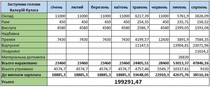 Заступник Валерій Кулага крім окладу отримує доплату за ранг, за вислугу років та премію у розмірі 6500 грн. А от надбавки у розмірі 50 % немає.