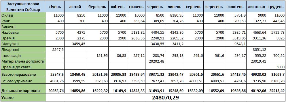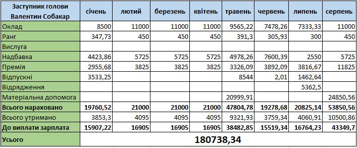 Заступник Валентин Собакар також має доплати до окладу. Йому нараховували за ранг, надбавку 50 % та щомісячну премію. Доплати за вислугу немає.