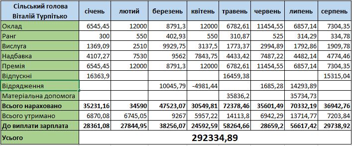 У минулому році голова сільради двічі був у відпустці та двічі у відрядженні, за що отримав відповідні нарахування. Матеріальну допомогу у 2022-му йому нарахували двічі – 34 827 грн у липні та 35 370 грн у листопаді. У 2023 році Віталій Турпітько тричі отримував відпускні та двічі (у травні та липні) матеріальну допомогу у розмірі майже 36 тисяч гривень.