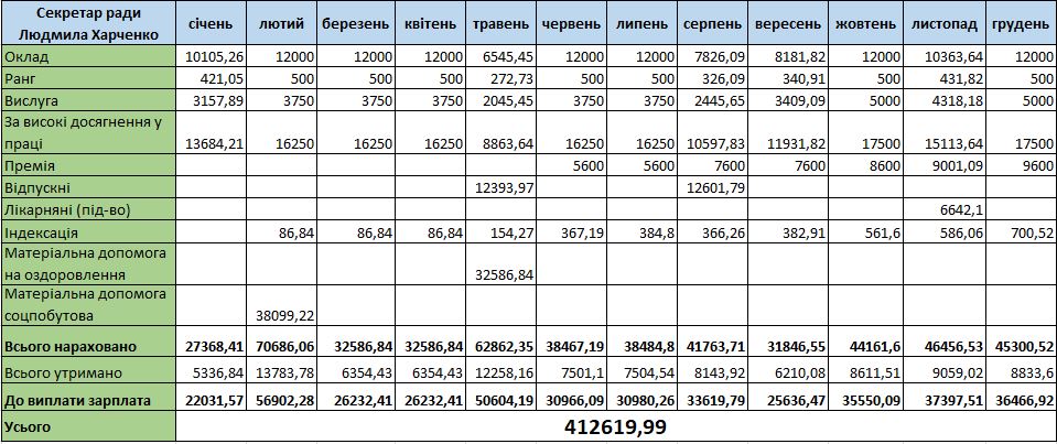 У минулому році премію секретар почала отримувати лише з червня. Спочатку її розмір становив 5 600 грн, але поступово зростав, доки наприкінці року дійшов до 9 600 грн. Цьогоріч премію Людмилі Харченко нараховували лише в деякі місяці й її розмір коливався від 2 до 3 тисяч.