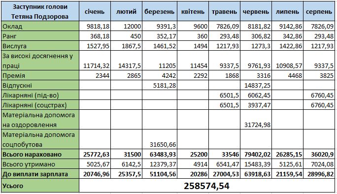 У запиті нам надали інформацію і про зарплату заступниці сільського голови. Оклад Тетяни Подзорової – 12 тисяч гривень. Вона має доплати за вислугу (1 867,5 грн), за ранг (450 грн) та 14317,5 грн надбавки за високі досягнення у праці.