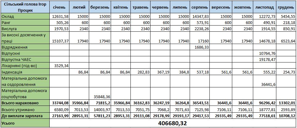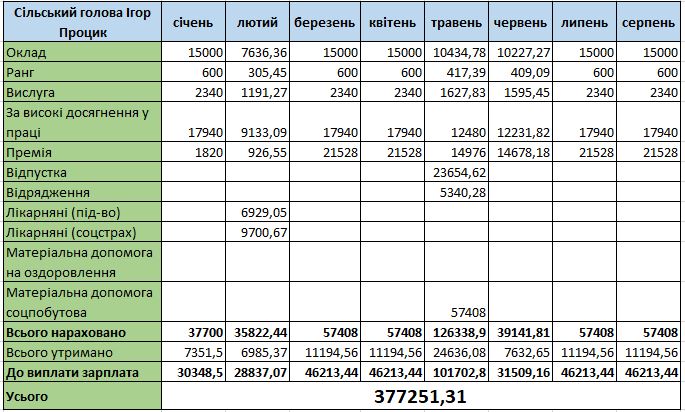 Найбільша сума на руки в очільника громади була у травні 2022 року за рахунок відпускних, премій, надбавок та матеріальної допомоги – 101 702 грн. У середньому за місяць, після сплати податків, у 2022 році Ігор Процик отримував понад 29 тисяч, а в 2023-му – трохи більше 46 тисяч.