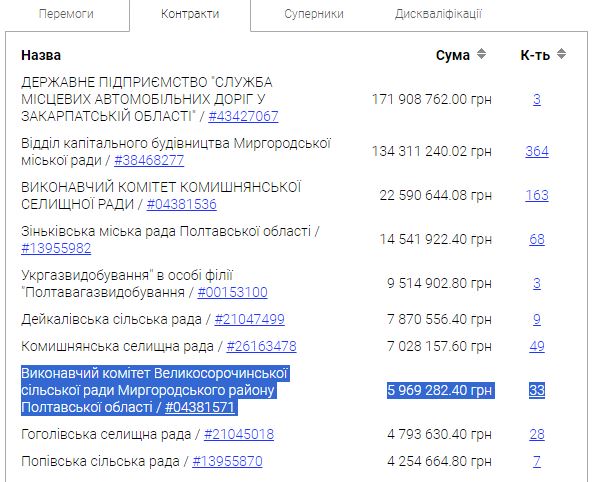 За даними аналітичної платформи Clarity Project, ПрАТ «Миргородський Агрошляхбуд» підписало через Prozorro понад 952 договори загальною вартістю 417,17 млн грн. Зокрема, компанія отримала від відділу капітального будівництва Миргородського виконкому 364 угоди на понад 134 млн грн, а від виконкому Великосорочинської сільської ради 33 контракти на майже 6 млн грн.