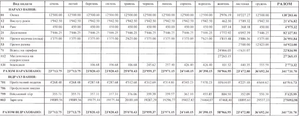Найбільшу зарплату Володимир Гетало отримав у жовтні 2022 року — майже 59 тисяч. Така сума вийшла, зокрема, через відпускні (24 446 грн) та матеріальну допомогу на оздоровлення (27 265 грн).