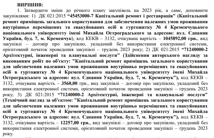 В опублікованому протоколі вказано, що в 2023 році в гуртожитку № 4 уже проводили  ремонтні роботи приміщень для забезпечення належних умов проживання ВПО та евакуйованих осіб. Тоді на роботи виділили 711 522 грн з держбюджету. Роботи виконувало  комунальне госпрозрахункове  підприємство “Союзрембуд”.  Проте, виникла додаткова потреба і були виділені додаткові кошти для продовження ремонтних робіт. У зв’язку з цим 13.12.2023 університет уклав додаткові договори: на продовження капітального ремонту приміщень гуртожитку №4 з КГП “Союзрембуд” на суму 1 045 892 грн., на супроводження робіт і авторський нагляд на суму 3 560 грн., на здійснення технічного нагляду за ходом робіт на суму 12 257 грн.