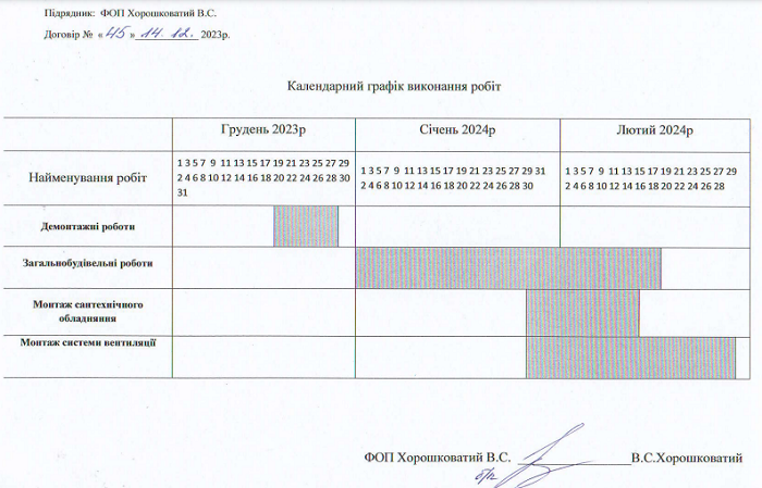 З договору відомо, що роботи мають розпочатись в грудні цього року і завершитися в лютому 2024-го. У переліку: демонтажні та штукатурні роботи, грунтування і фарбування стін, влаштування вентиляції та заміна сантехніки.