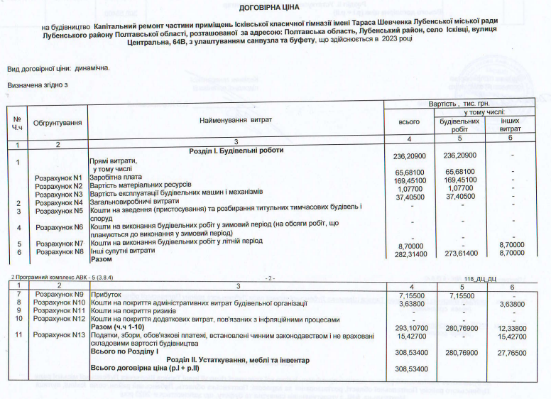 На загальновиробничі витрати виділили 37 405 гривень, а прибуток підрядника становитиме 7 155 гривень.