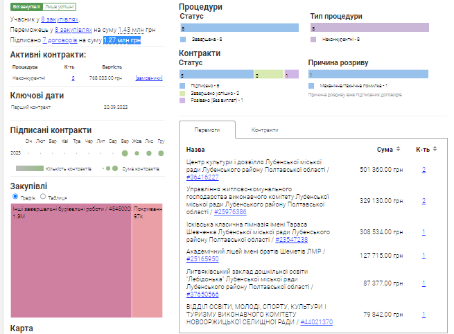 Договір підписали з ФОП Хорошковатий Володимир Сергійович. За даними youcontrol, чоловік зареєстрований як підприємець наприкінці серпня 2023 року в місті Лубни. Володимир Хорошковатий зареєстрував 11 видів діяльності, з яких виділив як основний – будівництво житлових і нежитлових будівель. Серед іншого, він займається оптовою торгівлею деревиною, наданням в оренду будівельних машин і устаткування тощо.