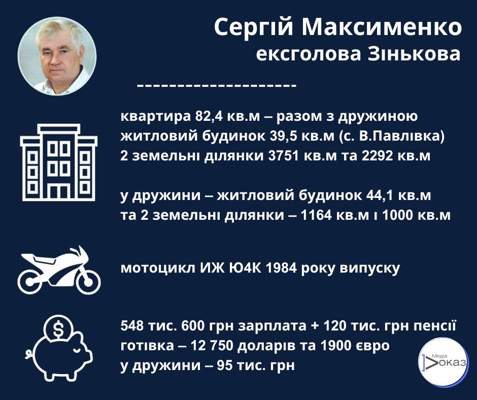 З 2019 року посаду міського голови Зінькова обіймав Сергій Максименко, але на початку серпня 2023 року він склав із себе повноваження і під час засідання 35 сесії Зіньківської міської ради 8 скликання його урочисто провели у відставку. Він подав декларацію 18 серпня 2023 року, а через три дні виправлену, і ще одну при звільненні.