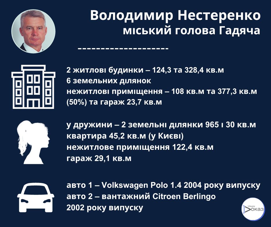 Гадяцьку міську територіальну громаду очолює Нестеренко Володимир Олександрович. Він задекларував своє майно за 2022 рік другого серпня цього року. Виправлену декларацію він подав дев’ятого серпня. Згідно з нею, у минулому році меру Гадяча нарахували 742 тис. 776 грн зарплатні. Його дружина Любов отримала в 2022 році 170 тис. 50 грн доходу від підприємницької діяльності (жінка керує ТОВ “ІЛМА”).