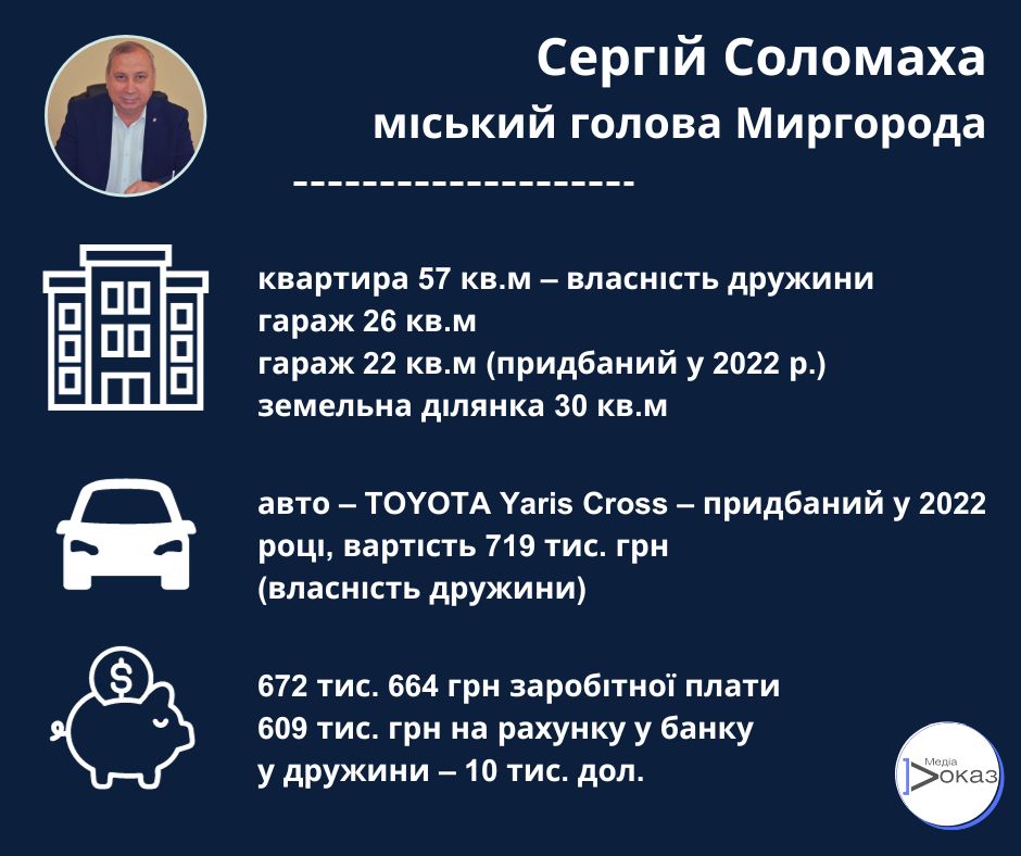 Миргородську міську територіальну громаду очолює Соломаха Сергій Павлович. Він подав декларацію за 2022 рік 16 березня 2023 року. Згідно з нею, за минулий рік йому виплатили 972 тис. 664 грн заробітної плати. Також він отримав 4 тис. 755 грн від банку, 209 тис. 344 грн пенсії, 500 тис. грн від продажу рухомого майна.