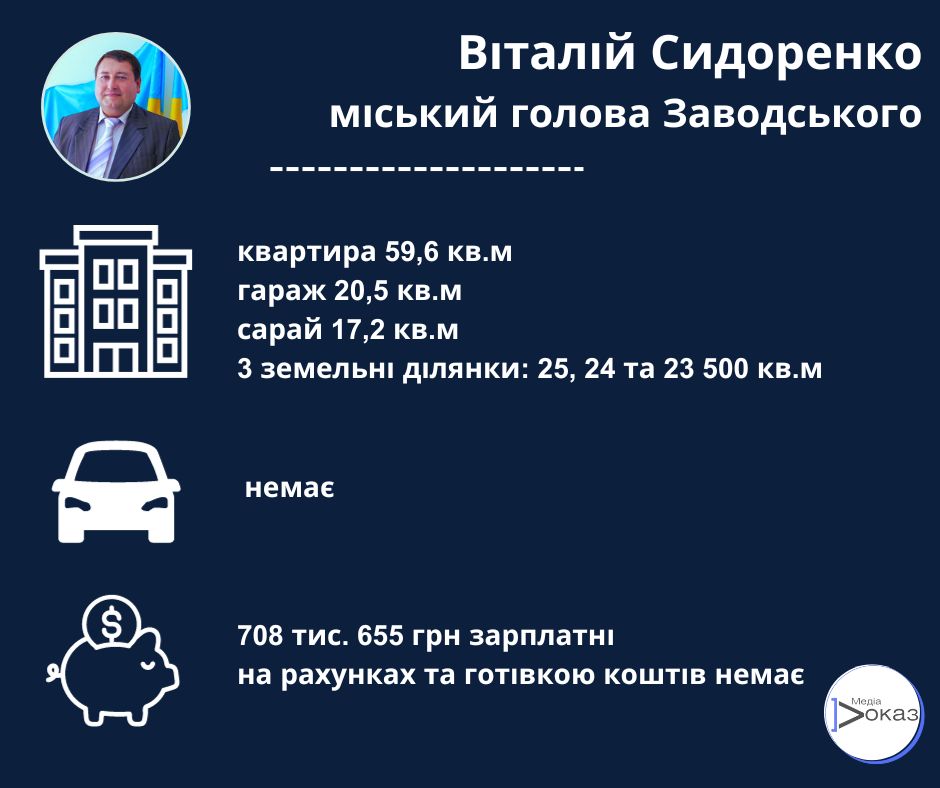 Загалом серед нерухомого майна Віталій Сидоренко вказав квартиру в місті Заводське (59,6 кв.м), яку придбав у 2018 році за 155 тис. 856 грн, гараж (20,5 кв.м), сарай (17,2 кв.м) та три земельні ділянки, дві з яких розташовані у Заводському (25 і 24 кв.м) та одна (23 500 кв.м) в селі Гаївщина.