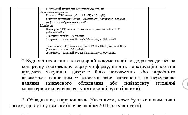 Лікарня замовила мобільну рентгенівську систему із С-дугою Siemens ARCADIS VARIC, детально прописавши характеристики необхідного обладнання. Крім того, в тендерному оголошенні зазначалося, що обладнання, запропоноване учасником, може бути як новим, так і таким, що було у вжитку (але не раніше 2011 року випуску).