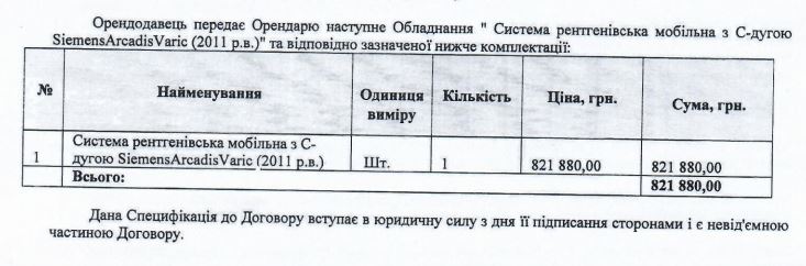 Згідно з контрактом, компанія передавала в оренду мобільну рентгенсистему вже згадуваної марки Siemens ARCADIS VARIC із С-дугою. Рік випуску цього обладнання – 2011.
