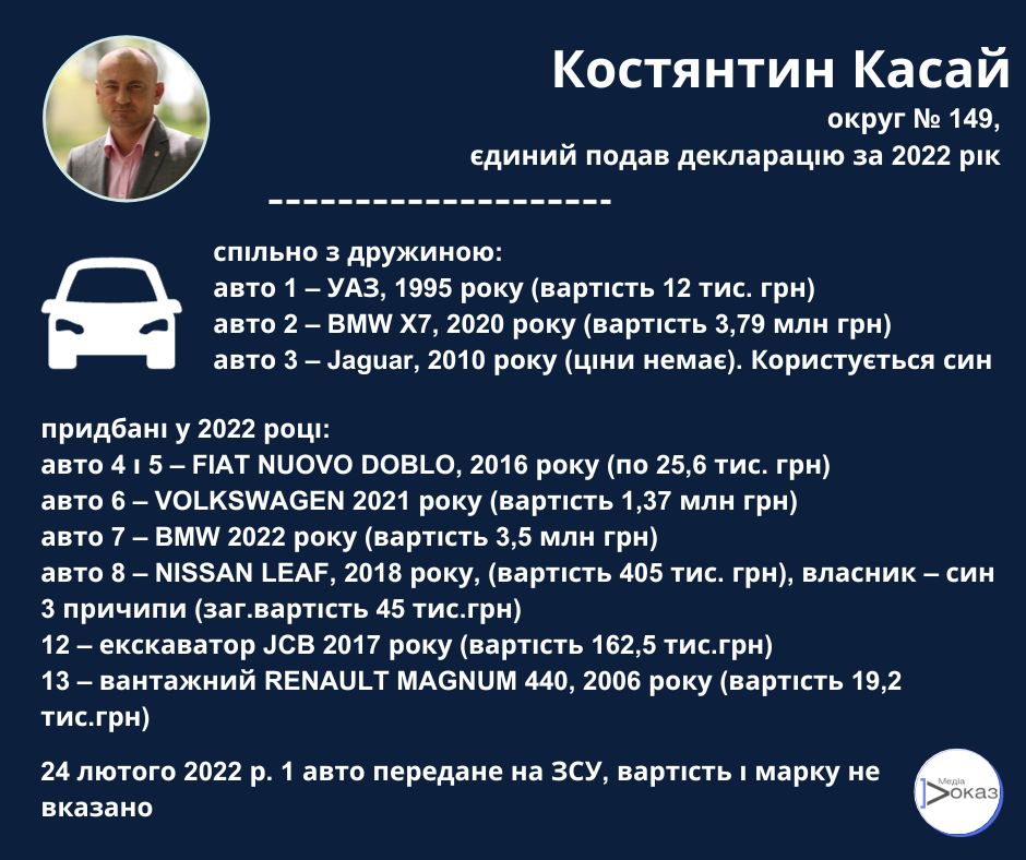 У перший рік повномасштабного вторгнення родина нардепа придбала 7 автівок та три причепи. Так, Костянтин Касай декларує у спільній власності із дружиною придбані у 2022 році: напівпричеп ASCA 2003 року (вартість 3 тис.), причіп ЛЕВ 2016 року (вартість 2 тис.), причіп ROBUSTE KAISER 1999 року (вартість 40 тис.), екскаватор-навантажувач JCB 2017 року (вартість 162,5 тис.), вантажний RENAULT MAGNUM 440, 2006 року (вартість 19,2 тис.).