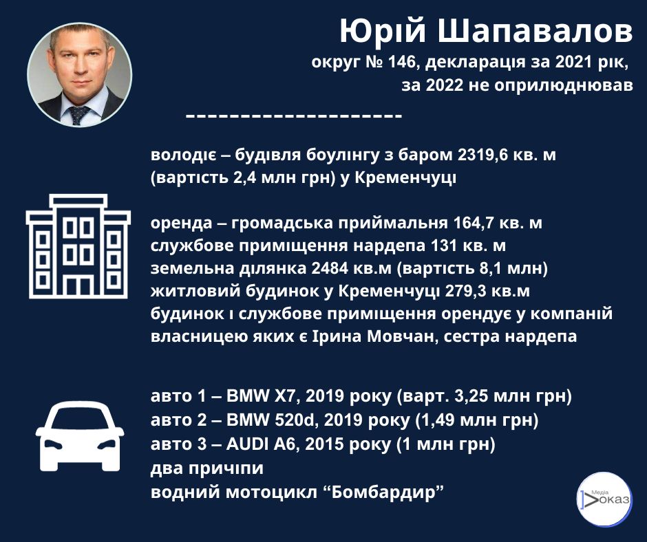 Юрій Шаповалов володіє трьома автівками: BMW X7 M50i/G07, 2019 року (вартість 3,25 млн грн), BMW 520d xDrive/G30, 2019 року (вартість 1,49 млн грн) і AUDI А6, 2015 року (вартістю 1 млн грн). Також у володінні нардепа два причіпи та водний мотоцикл “Бомбардир”.