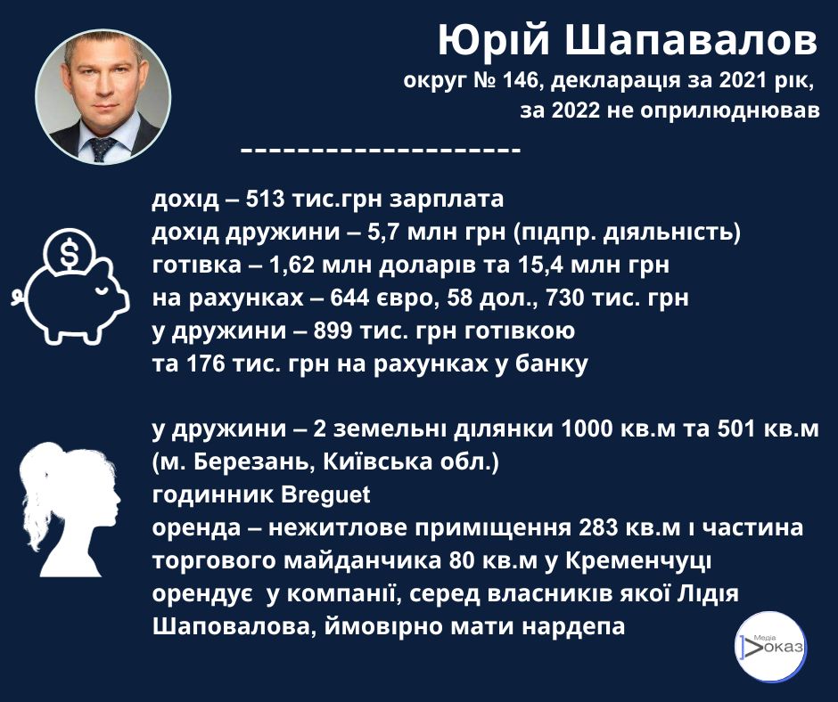 Як і Анастасія Ляшенко, Юрій Шаповалов у грудні 2023-го подав лише декларацію за 2021 рік, поки що не надавши е-декларування за перший рік після російського вторгнення.
