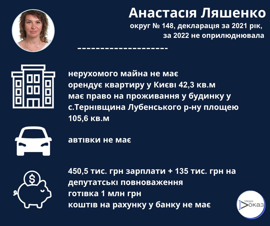 Народна депутатка Анастасія Ляшенко балотувалася по округу № 148 (місто Лубни, Великобагачанський, Оржицький, Семенівський, Хорольський райони, частина Лубенського району).