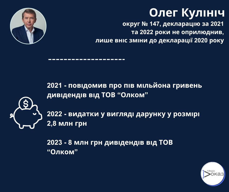 Народний депутат Олег Кулініч балотувався по округу № 147 (місто Миргород, Диканський, Зіньківський, Миргородський, Решетилівський, Шишацький райони). Востаннє він подавав е-декларування за 2020 рік. Після того лише вносив зміни.