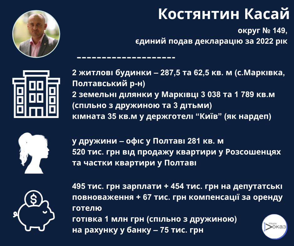 Костянтин Касай у деклараціях за 2021 та 2022 роки вказав, що має два будинки у селі Марківка Терешківської громади Полтавського району. Один з них площею 287,5 кв.м. Ним сім’я Касаїв володіє з 2014 року. Крім того, він декларує право спільної власності разом з дружиною на будинок у Марківці площею 62,5 кв. м.