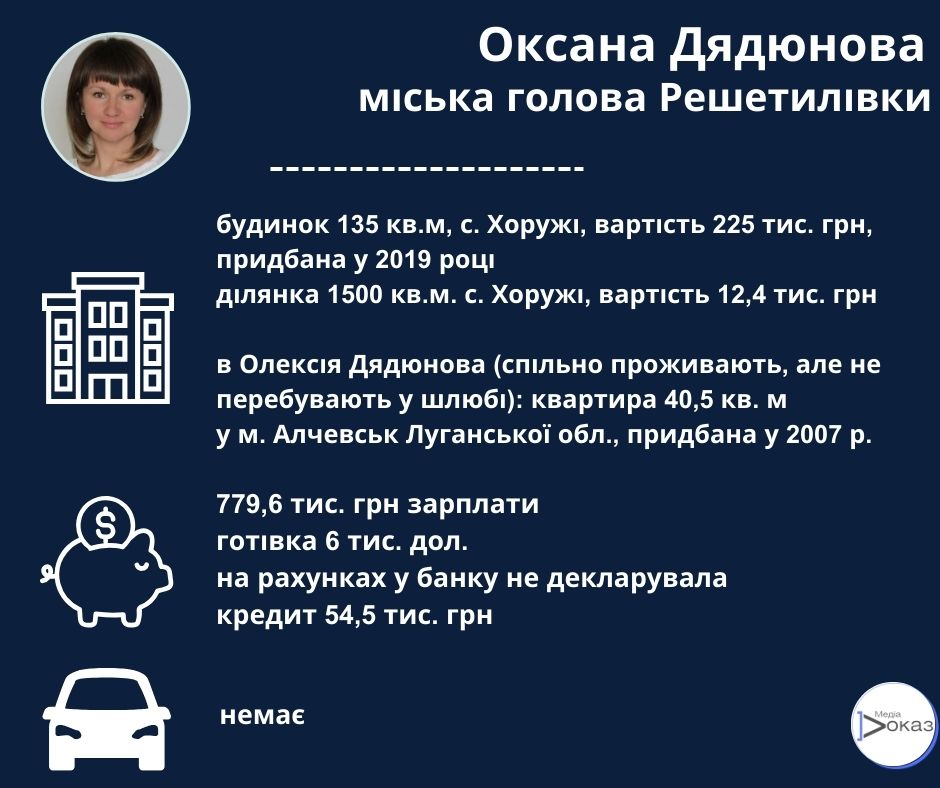 Решетилівську територіальну громаду очолює Дядюнова Оксана Анатоліївна. 19 січня 2024 року вона оприлюднила декларацію за 2021 рік, а трохи пізніше, 22 січня, за 2022 рік. Членами родини вона вказала доньку та сина, а також Олексія Дядюнова, з яким спільно проживає та не перебуває у шлюбі (схоже, подружжя розлучилось).