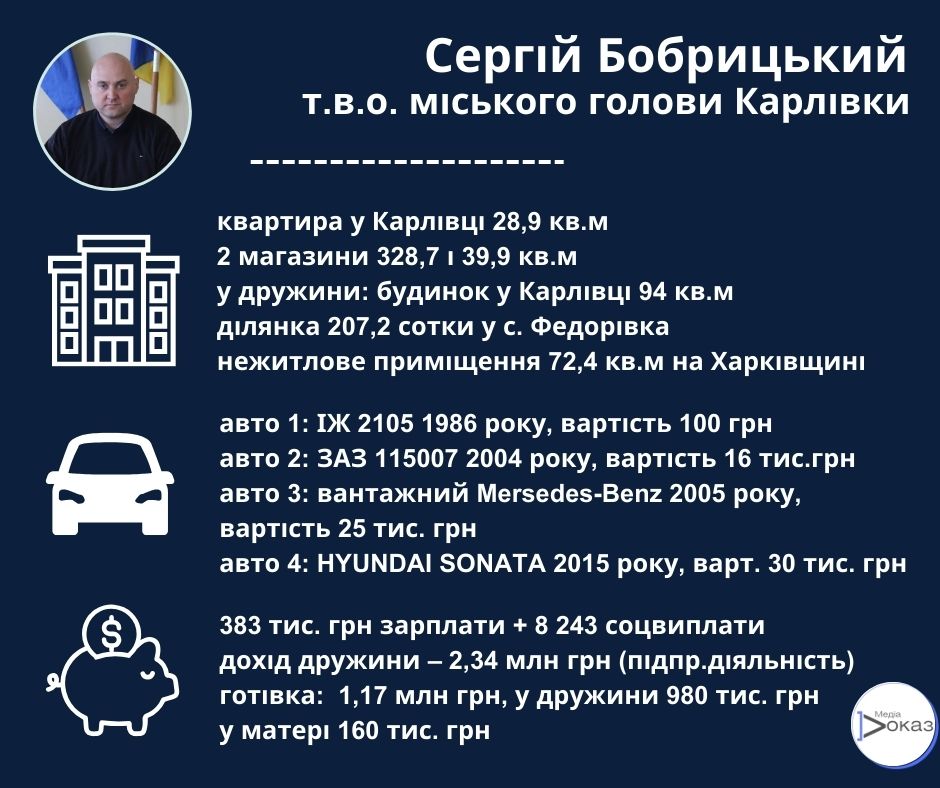 Дружина секретаря і виконуючого обов’язки мера Карлівки Вікторія Бобрицька, займаючись підприємницькою діяльністю заробила у 2021 році 992 тис. 841 грн, а у 2022 – 2 млн 346 тис. 983 грн. Варто зазначити, що жінка активно бере участь у закупівлях: надає послуги карлівським комунальним підприємствам, відділу освіти та молоді міськради, Мартинівській сільраді тощо.