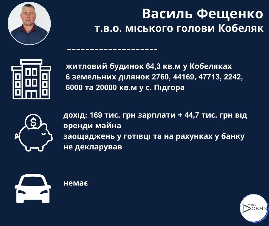 З 2022 року обов’язки кобеляцького міського голови виконує секретар міської ради Фещенко Василь Васильович. Він подав свою декларацію за 2022 рік 17 січня 2024 року. Також чоловік оприлюднив свіжу декларацію за минулий рік, яка відрізняється від попередньої хіба що доходами.