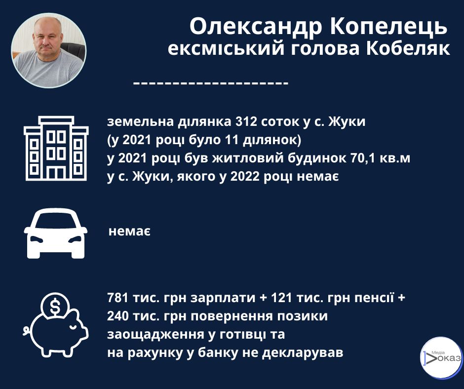 Ексмер Кобеляцької міської ради Копелець Олександр Олександрович оприлюднив декларації за 2021 і за 2022 неповний рік 31 січня 2024 року. Того ж дня він подав декларацію перед звільненням з посади.