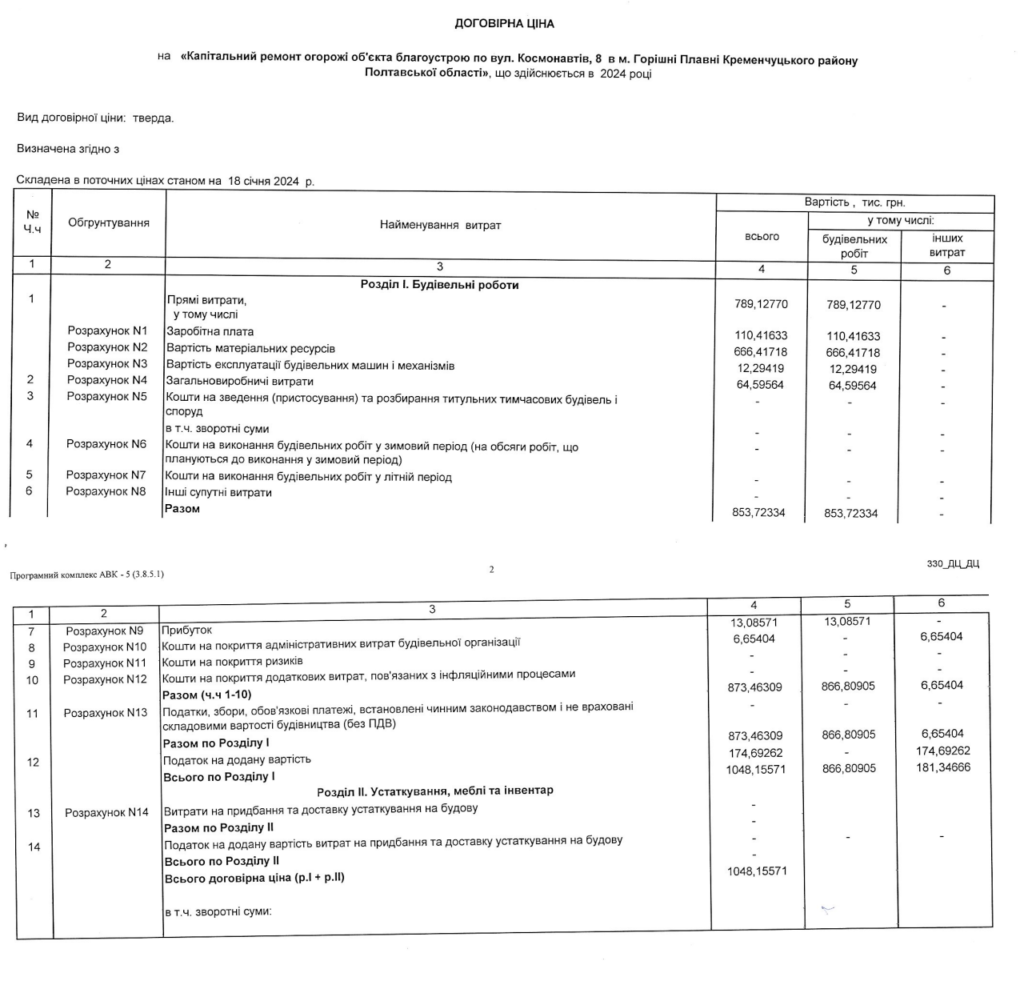 Згідно з договірною ціною, на прямі витрати спрямують 789 тис.грн, у тому числі на заробітну плату – 110 тис., вартість матеріальних ресурсів – 666 тис. загальновиробничі витрати – 64 тис. грн тощо. Загалом на будівельні роботи розраховано 853 тис. грн. Прибуток підрядника складе трохи більше 13 тисяч гривень. Податок на додану вартість становить майже 175 тис. грн.
