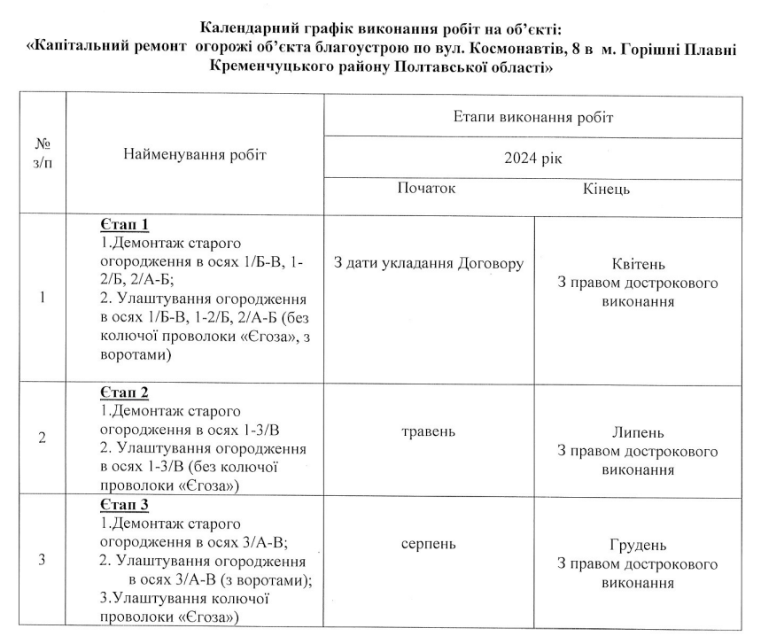 Самі ж роботи мали розпочатися відразу після укладення даного договору і завершитися в грудні 2024 року. Капітальний ремонт виконуватимуть у три етапи, під час яких підрядник демонтує стару огорожу та встановить нову, вже у серпні він виконає завершальні роботи з улаштування колючого дроту “Єгоза”, змонтує ворота та улаштує хвіртки.
