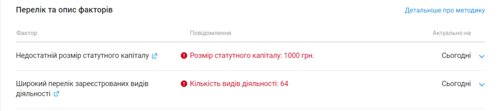 Youcontrol зазначає, що компанія має недостатній розмір статуного капіталу та широкий перелік видів діяльності. Останнє, за даними аналітичної системи, в деяких випадках може свідчити про те, що діяльність контрагента не спрямована на досягнення реальних результатів господарських операцій і має ознаки фіктивності.
