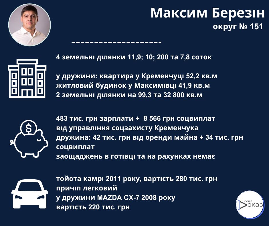 Посадовець задекларував майже 483 тисячі гривень зарплати впродовж року роботи в Управлінні справами Апарату Верховної Ради України, ще 42 тисячі гривень родина отримала завдяки тому, що Діна Березіна надала майно в оренду. Також варто зазначити, що у 2022 році подружжя Березіних отримало соціальні виплати від Управління соцзахисту населення Автозаводського району Кременчуцької міськради: мова йде про понад 43 тисячі гривень загалом.