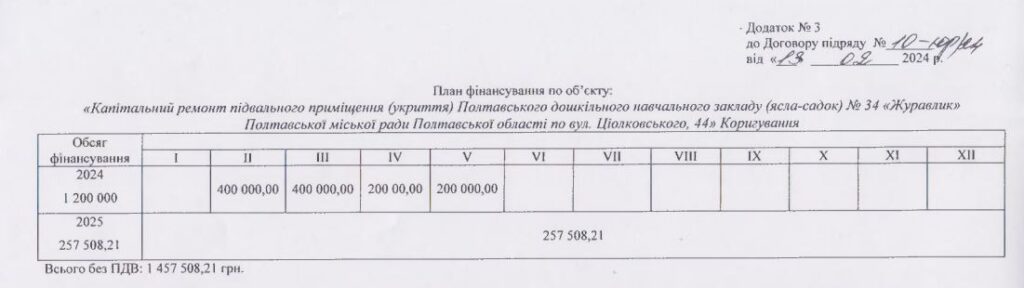 Як вказано у договорі, фінансування робіт у 2024 році орієнтовно складе 1,2 млн грн без ПДВ. Ще 257,5 тис. грн заплановано на 2025 рік.