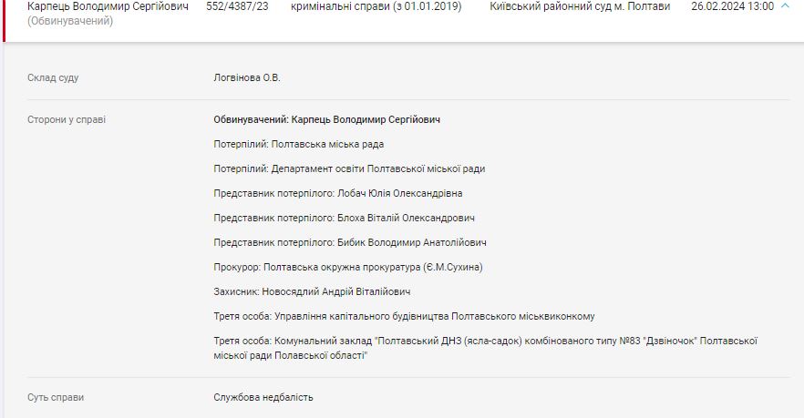 Як свідчить графік призначених засідань, розгляд цієї справи триває у Київському районному суді м. Полтави.