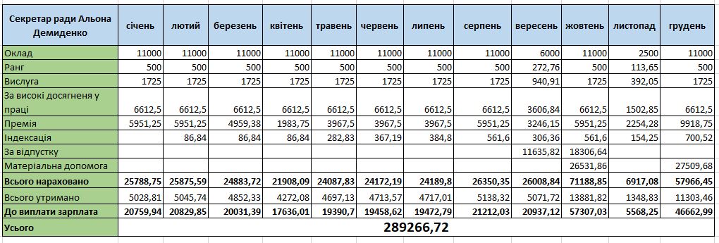 У 2022 році секретар селищної ради у середньому отримувала на руки, після сплати військового збору та податків, понад 20 тисяч гривень на місяць. У 2023-му щомісячна зарплата дещо зросла за рахунок премії – у середньому виходить приблизно 25,5 тисяч. Найбільша її зарплатня – 57 307 грн – була у жовтні 2022-го, коли вона пішла у відпустку.