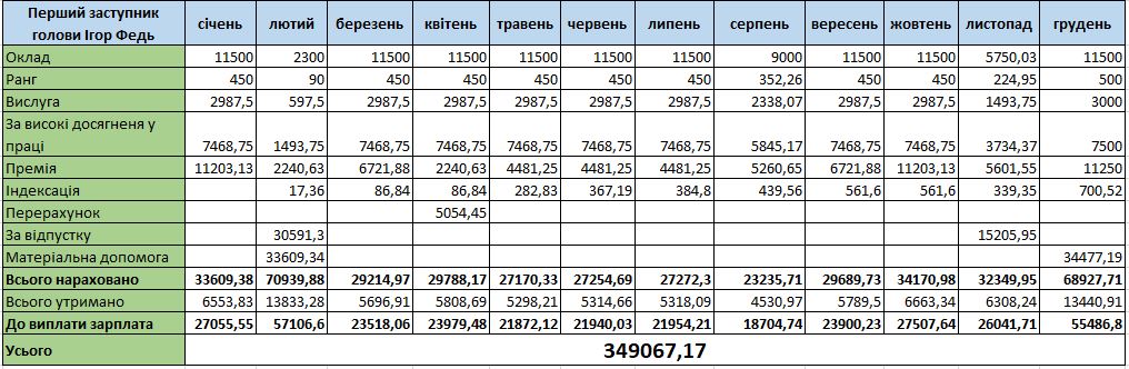 У запиті нам надали інформацію про зарплату першого заступника селищного голови Ігоря Федя. Він має оклад 11 500 гривень. Отримує також надбавки: 500 грн за ранг, 3000 грн за вислугу та 7 500 грн надбавки за високі досягнення. Щомісячна премія варіювалась від 2 240 до 13 500 гривень.