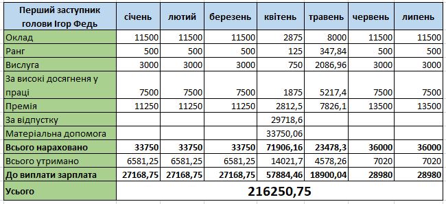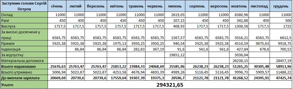 У 2022 році перший заступник найбільшу зарплату на руки отримав у лютому — 57 тисяч 106 гривень. Така сума вийшла, зокрема, через матеріальну допомогу (33 609 грн) та відпускні (30 591 грн). У 2023 році найбільше нарахувань було у квітні: 57 тисяч 884 гривні, знову за рахунок відпускних та матеріальної допомоги.