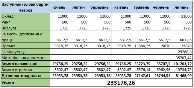 Найбільшу зарплату Сергій Петров отримав у липні 2023 року — 81 468 грн. Така сума вийшла, зокрема, через відпускні (29 788 грн), премію (15 870 грн) та матеріальну допомогу (35 707 грн). У 2022 році – у жовтні та грудні – заступник також отримав матеріальну допомогу в розмірі понад 26 та майже 28,5 тисяч гривень.