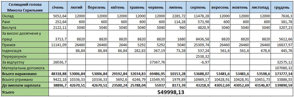 Тричі у 2022 році Микола Скрильник брав відпустку, за що отримав відповідні нарахування. У 2022 році він отримав матеріальну допомогу, одну на рік: у грудні посадовцю нарахували понад 107 тисяч гривень. Відповідно у цей місяць у селищного голови була і найвища зарплатня – 139 890 грн.