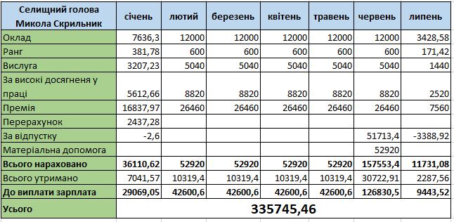 За перше півріччя 2023-го року селищний голова також отримав матеріальну допомогу. У червні йому нарахували майже 53 тисячі гривень, тому зарплатня у цей місяць також була підвищеною. Загалом на руки очільник громади отримав майже 127 тисяч.