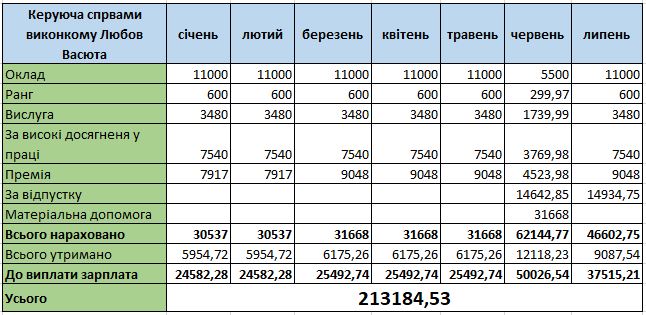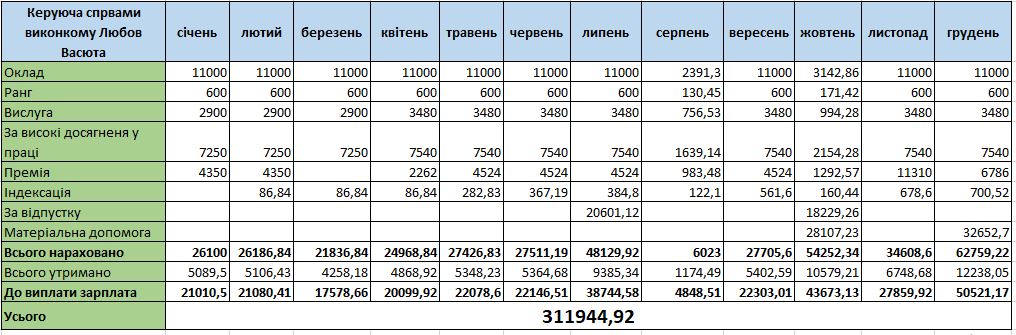 У 2022 році Любові Васюті двічі нарахували матеріальну допомогу: 28 107 грн у жовтні та 32 652 грн у грудні. У червні 2023 року посадовиці також виплатили матеріальну допомогу – 31 668 грн.